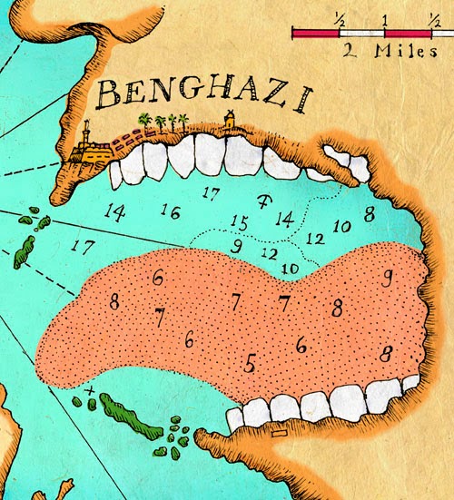 When a tragedy is endlessly exploited, the world starts to look out of balance. I was looking at an old map of the port of Benghazi, which reminded me of an open mouth. I thought this was an apt metaphor for all the the political noise surrounding this incident. That's what I tried to convey with this drawing.